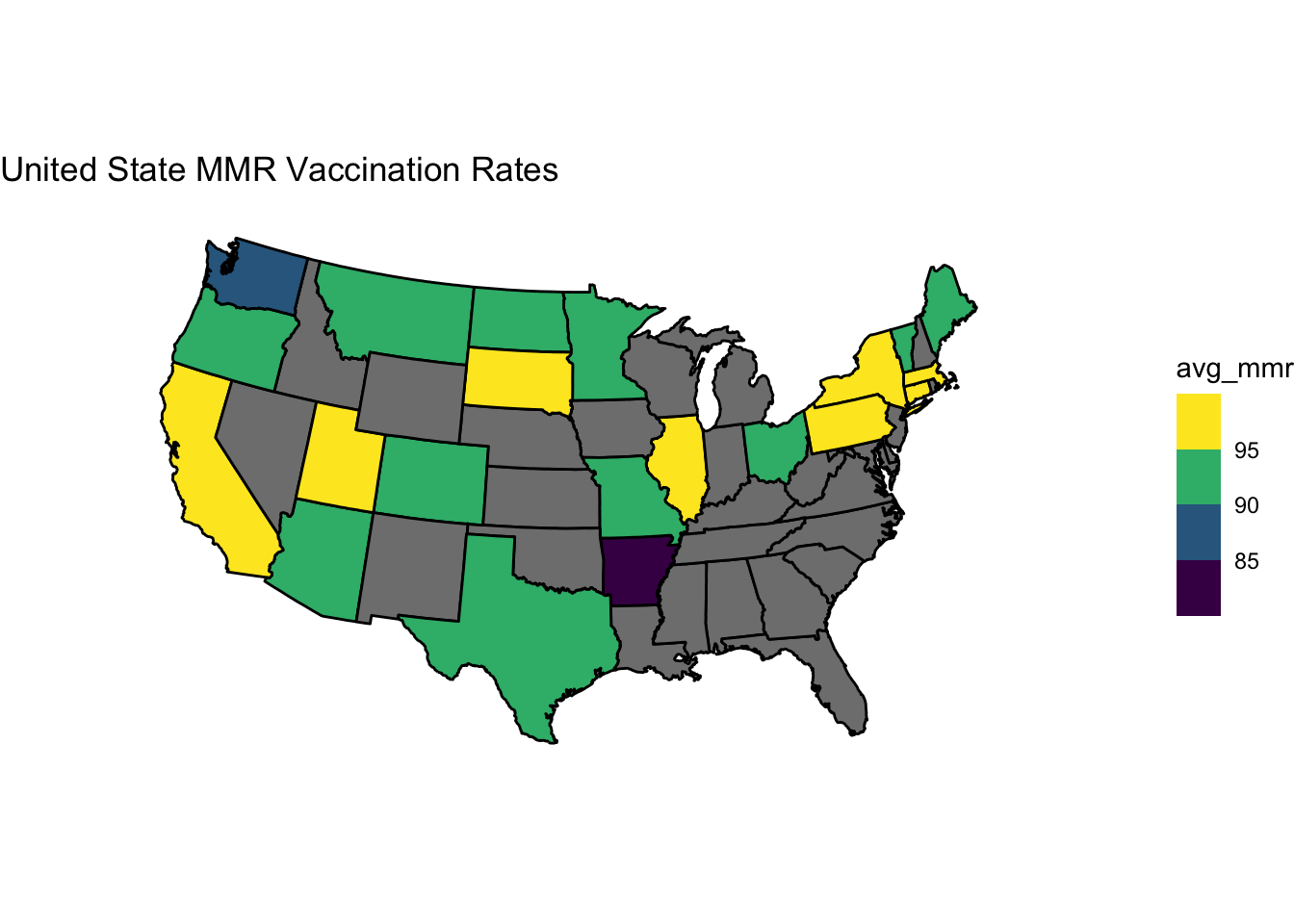 Using this data set we can see trends on how vaccination rates differ by state and school type. That being said many states are missing from this dataset and many schools have many null values. I eliminated null values for the first map in the mmr avg and in doing so inadvertently eliminated 11 states completly (of 32) that only had null data for mmr vaccines. Moving forward I would love to look at vaccination datat from the rest of the states. I would be curioes to also explore vaccination rates in the years leading up to the pandemic vs after the pandemic. Are people more likely to get vaccinated after a global pandemic?