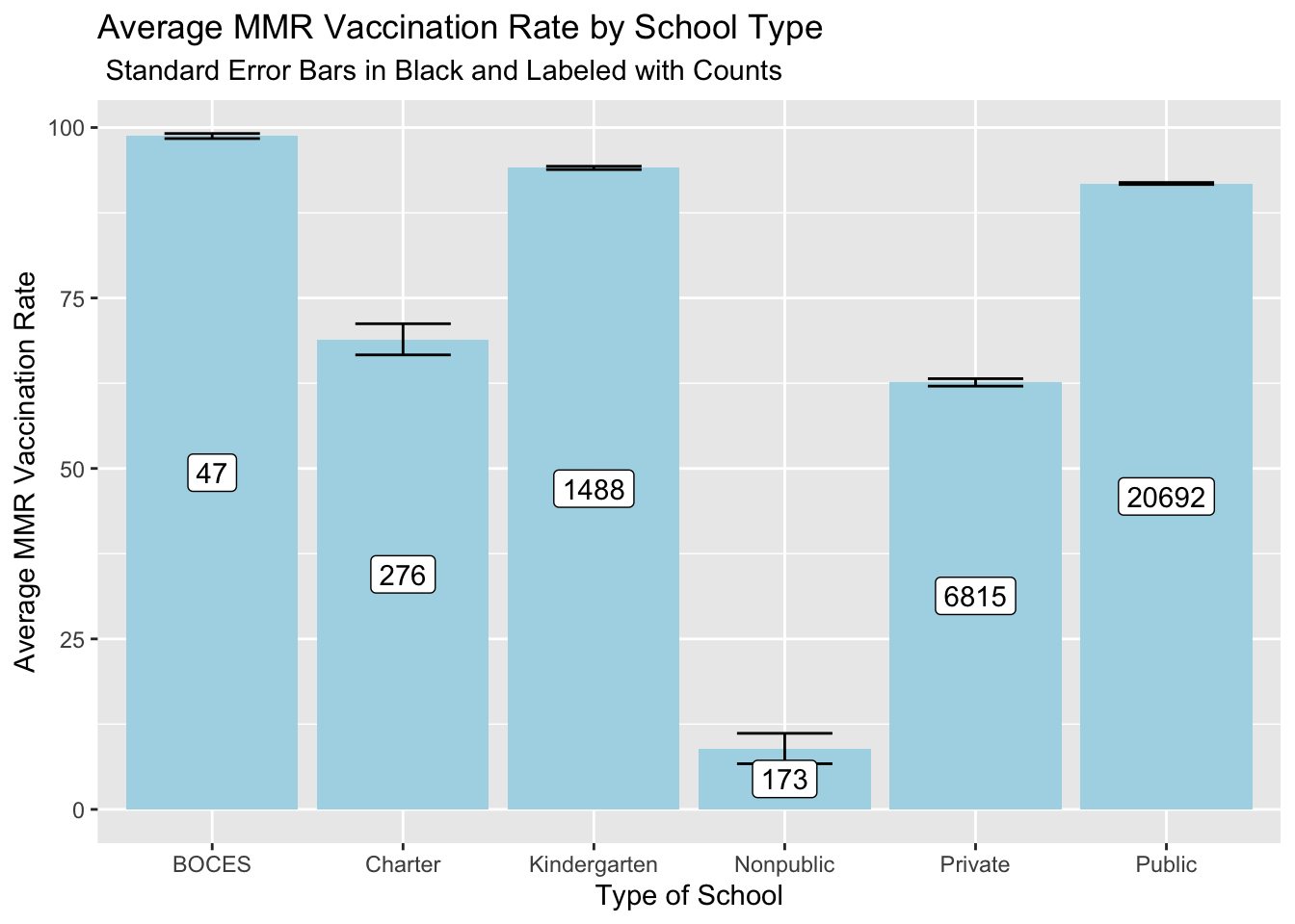 In this visual we can see how vaccination rates of MMR differ throughout school types. The standard error of the means is depicted in the black bars with no overlap between groups. The non-public schools have a remarkably low vaccination rate compared to any other group followed by private then charter schools. The number of schools in each sample group can be seen in the white box on each column. We can also see at BOCES, kindergarten and public schools almost all kids have received their MMR vaccines.