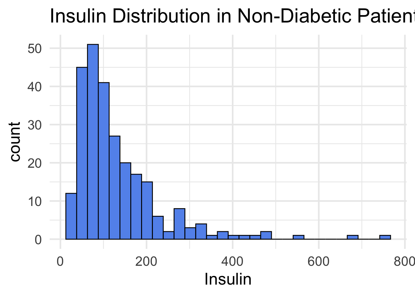 The first tab in the shiny app allows the user to select a predictor and compare the distribution of diabetic and non-diabetic groups. Differences in the two distributions could indicate a strong predictor to be implemented in the other tabs. An example output of Insulin levels between the two groups is displayed below. Notice the higher insulin levels in the diabetic group (red).