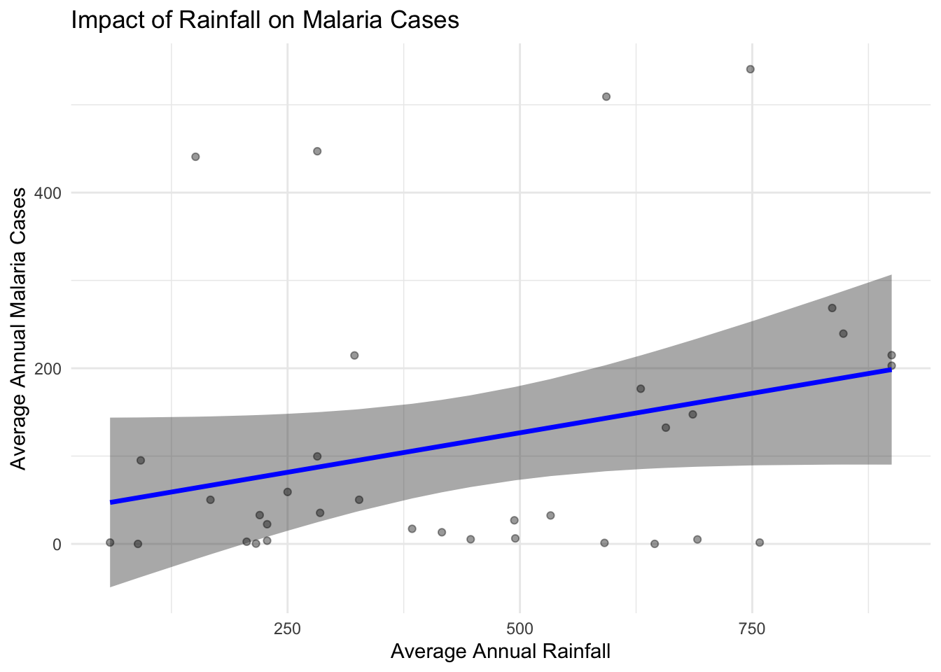 Through this visual we can see that there is a positive relationship between Annual Rainfall and Malaria Cases. As rainfall increases so too does Malaria cases. The individual points are also plotted in the background to show distribution of and number of cases in sample.